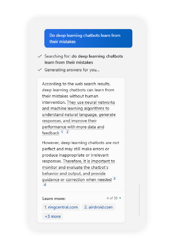 Chatbots can learn from interactions with people or from other sources, such as the vast body of conversations found on the World Wide Web. They can understand natural language and produce meaningful responses. Modern deep-learning chatbots are very sophisticated and can process complex questions and instructions. They learn from interactions over time and improve themselves when made aware of mistakes.