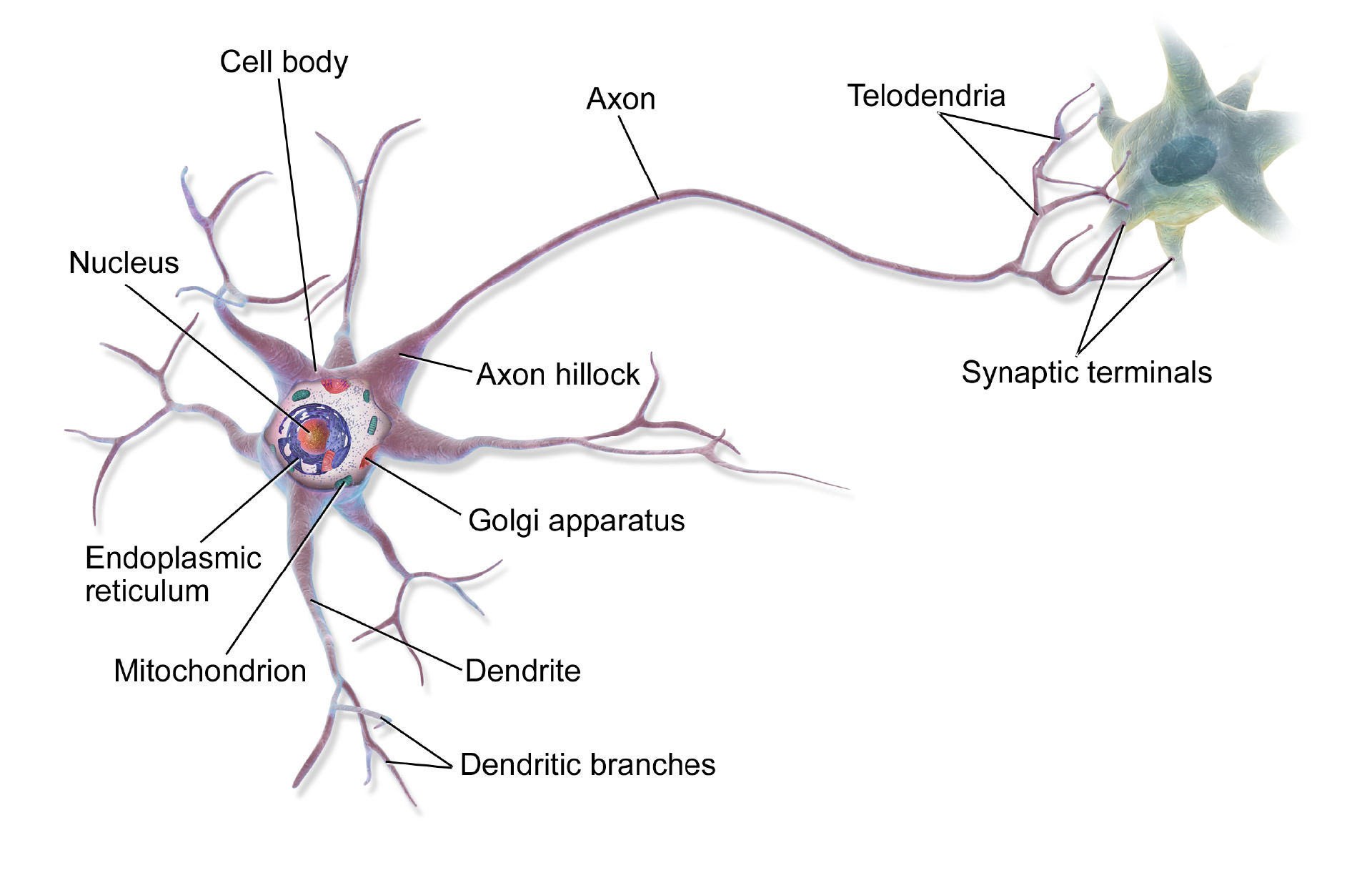 Diagram of a human neuron. Signals are received through the dendrites (left) and sent out through the axon (right).